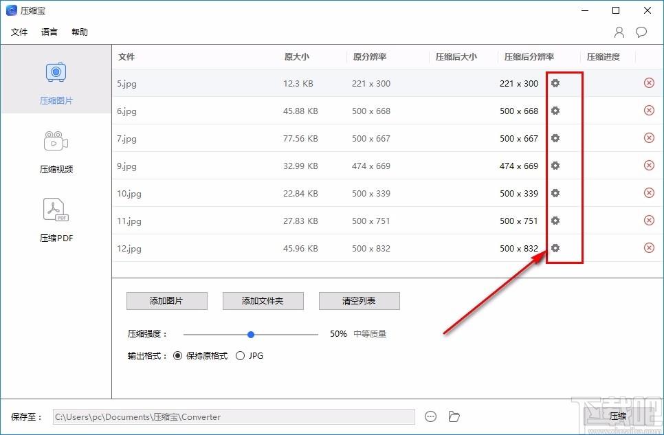 2、点击对应图片设置按钮即可设置图片压缩后的分辨率